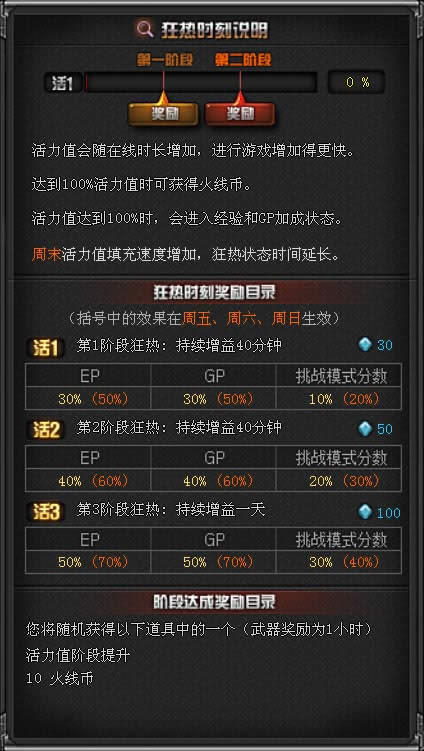 活力值会随在线时长增长而增长,进行游戏则会增长的更快。达到100%活力时(即狂热时刻)可以获得火线币。不同阶段的狂热时刻获得的火线币也不同。