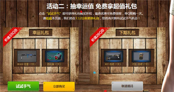 点击“试试手气”即可获得礼包购买折扣,最高优惠可免费领取,单Q限购一次。