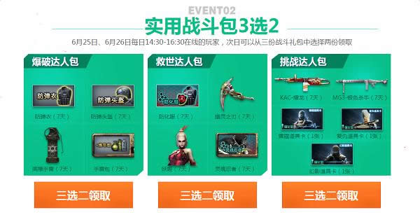 6月25日、6月26日每日14:30-16:30在线的玩家,次日可以从三份战斗礼包中选择两份领取