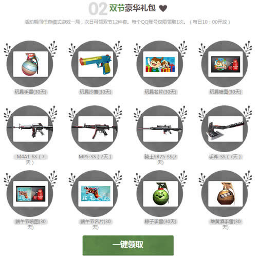 活动期间任意模式游戏一局,次日可领双节12件套。每个QQ账号仅限领取1次。(每日10:00开放)