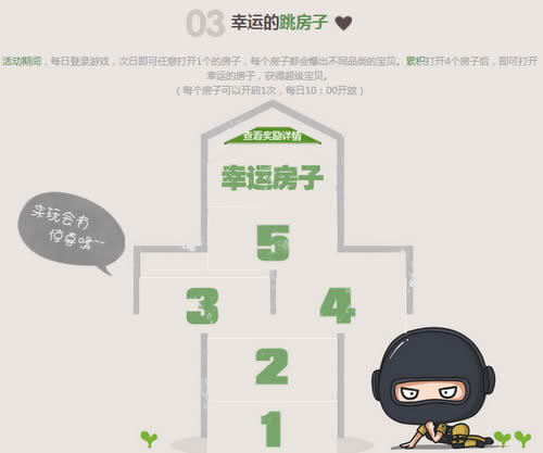 活动期间,每日登录游戏,次日即可任意打开1个的房子,每个房子都会爆出不同品类的宝贝。累积打开4个房子后,即可打开幸运的房子,获得超级宝贝。 (每个房子可以开启1次,每日10:00开放)