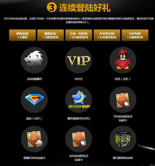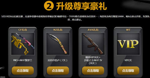 5月19日0点后新注册,在战争雷霆中游戏角色等级达到3级即可在一下STG联合游戏礼包任选其一:每款礼包每日限量2000,晚8点准点开抢,先到先得,抢完即止。