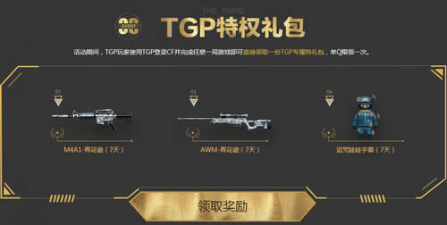 活动期间,TGP玩家使用TGP登录CF并完成任意一局游戏即可直接领取一份TGP专属特礼包,单Q限领一次。