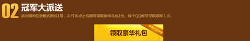 活动期间任意模式游戏1局,次日10点之后即可领取豪华礼包1份。每个QQ帐号仅限领取1次。