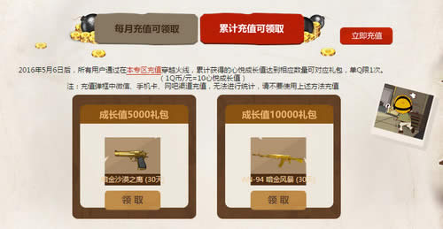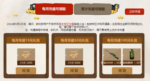 2016年5月6日后,腾讯 · 游戏家用户于自然月在本专区充值穿越火线(包括专区内购买道具)达到相应金额可领取相应礼包,单Q每个自然月限1次。