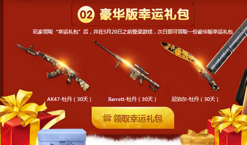 玩家领取“幸运礼包”后,并在5月20日之前登录游戏,次日即可领取一份豪华版幸运礼包
