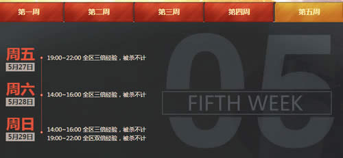 5月29日14:00~16:00 全区三倍经验,被杀不计19:00~22:00 全区双倍经验,被杀不计
