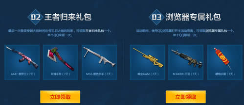 4. 幸运礼包、王者归来礼包、浏览器专属礼包、累计登录奖励,单个QQ限领一次。