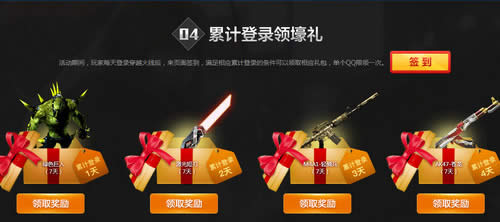 二、活动期间,玩家每天登录穿越火线后,来页面签到,满足相应累计登录的条件可以领取相应礼包,单个QQ限领一次。