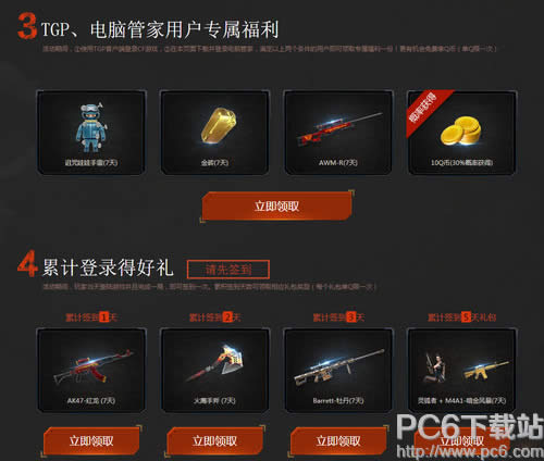 4.活动期间,①使用TGP客户端登录CF游戏,②在本页面下载并登录电脑管家,满足以上两个条件的用户即可领取专属福利一份!更有机会免费拿Q币(单Q限一次)。