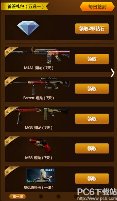 活动期间,每周的周一至周四,五级以上的玩家登录游戏后(当天登录游戏并且有登出记录)次日(既周二到周五)可到活动页面进行每日签到。每周第一次签到后,玩家可以领取“每周首签礼包”。之后每日签到可以领取两个钻石碎片。“每周首签礼包”包含一个稀有武器箱和两个钻石碎片,玩家打开稀有武器箱可以选择其中的一件道具领取。 稀有器宝箱(每周一个系列的道具)