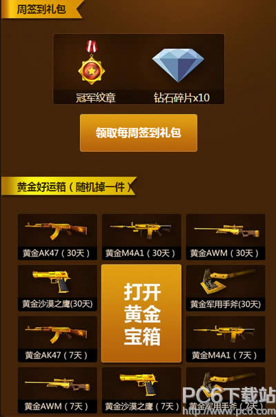 “周签到礼包”包含一个黄金好运箱、十个钻石碎片和一个冠军纹章。玩家打开黄金好运箱将会随机获得其中的一件道具。