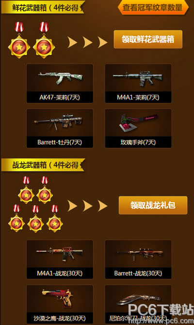 活动期间,玩家积累到2个冠军纹章可以获得鲜花武器箱,积累到5个冠军纹章可以获得战龙武器箱。