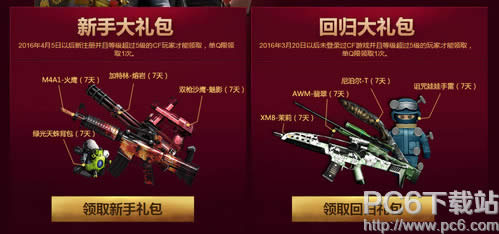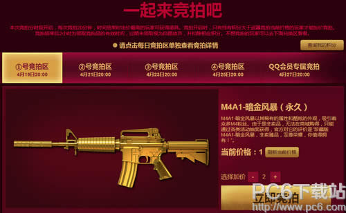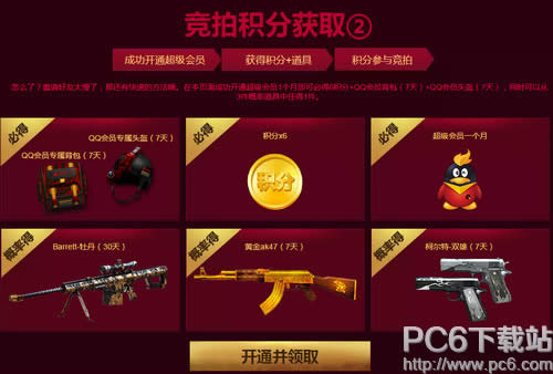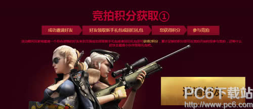 活动规则 1.竞拍时间:2016年4月19日-27日;兑换区开启时间:2016年4月19日 2.动期间每位玩家来到页面都可以抽2次幸运礼包,能不能抽到完全看你的运气哦!加油吧! 3.活动期间玩家每邀请一个符合资格的好友来到页面成功领取新手礼包或者回归礼包即可获得2积分,累计足够的积分即可在竞拍开始时段参与竞拍,还等什么赶快去邀请小伙伴领取礼包吧。 4.2016年4月5日以后新注册并且等级超过5级的CF玩家才能领取,单Q限领取1次。2016年3月20日以后未登录过CF游戏并且等级超过5级的玩家才能领取,单Q限领取1次。 5.在本页面成功开通超级会员1个月即可必得6积分+QQ会员背包(7天)+QQ会员头盔(7天),同时可以从3件概率道具中任得1件。 6.本次竞拍分时段开启,每次竞拍20分钟,时间结束时出价最高的玩家可获得道具。竞拍开启时,只有持有积分大于武器竞拍当前价格的玩家才能加价竞拍。竞拍结束后2小时为领取竞拍品的有效时间,过期未领取视为自愿放弃,并扣除(竞拍出价最高者)相应积分。 7.若因不可抗拒的因素,比如网络、作弊等非腾讯公司原因导致活动出现异常情况,腾讯保留在法律允许的范围内,对活动规则进行解释的权利。 cf永久武器全民竞拍活动网址: 了解最新CF的资讯,扫描或关注微信号:pc6game