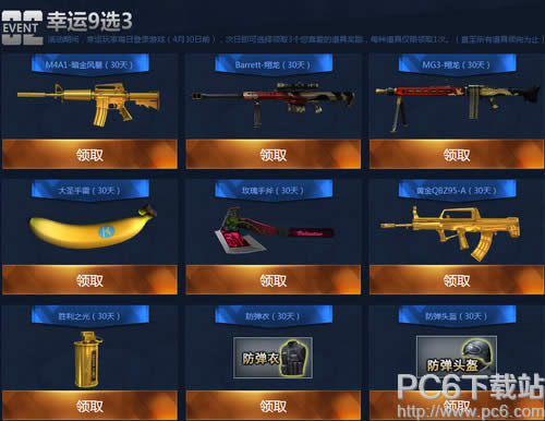 二、幸运9选3: 活动期间,幸运玩家每日登录游戏(4月30日前),次日即可选择领取3个您喜爱的道具奖励,每种道具仅限领取1次。(直至所有道具领完为止)