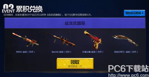 02 累积兑换 活动期间,玩家积累到10个钻石可以获得《战龙武器箱》。每个QQ账号仅限领取1次。