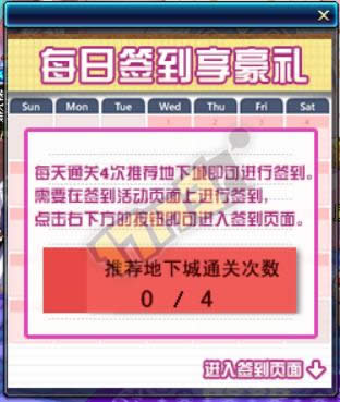 每日签到 一如既往的每天通关推荐地下城4次即可签到,活动页面暂未开放