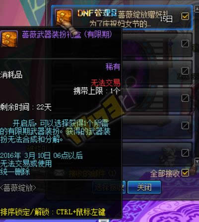 妇女节活动 赶不上情人节的策划,强行妇女节…… 登录游戏即可获得15天的蔷薇武器装扮盒1个(每个角色都能领取)