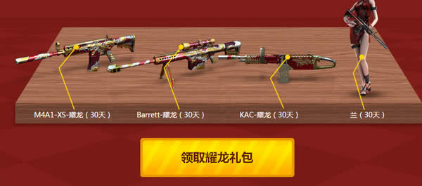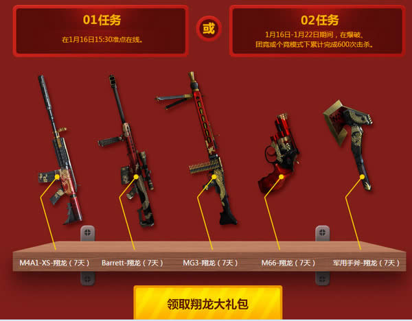 活动时间:2016年1月16日-2016年1月22日 领取时间:2016年1月17日-2016年1月23日 活动规则: 1.在1月16日15:30准点在线; 2.1月16日-1月22日期间,在爆破、团竞或个竞模式下累计完成600次击杀; 以上任务完成任意一个即可领取翔龙大礼包和黄金大礼包各一份,如果两个都完成了即可另外再领取一份耀龙大礼包。