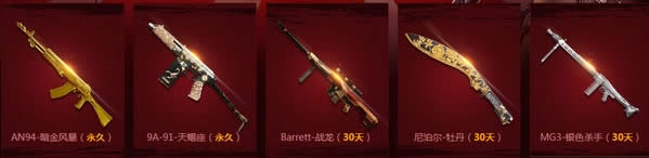 B蛋奖池:AN94-暗金风暴(永久)、9A-91-天蝎座(永久)、Barrett-战龙(30天)、尼泊尔-牡丹(30天)、毛瑟军用手枪-战龙(30天)、高爆手雷(7天)、复仇道具卡(1张)、灵狐者(7天)、AK47-紫罗兰(7天)、CheyTac M200-万圣节(7天)、愤怒的公牛左轮(7天)、打击者-天羽(7天)、M14EBR-蓝海(7天)、铁锤(7天 )、MG3-迷彩(7天)。