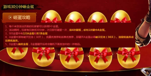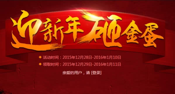 活动时间:2015年12月28日-2016年1月10日 领取时间:2015年12月29日-2016年1月11日 活动地址: 砸蛋攻略