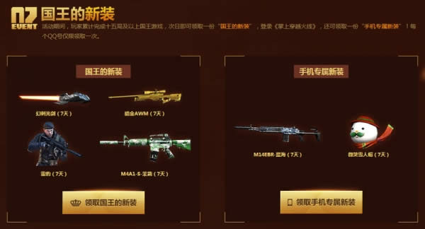 02国王的新装 活动期间,玩家累计完成十五局及以上国王游戏,次日即可领取一份“国王的新装”,登录《掌上穿越火线》,还可领取一份“手机专属新装”!每个QQ号仅限领取一次。