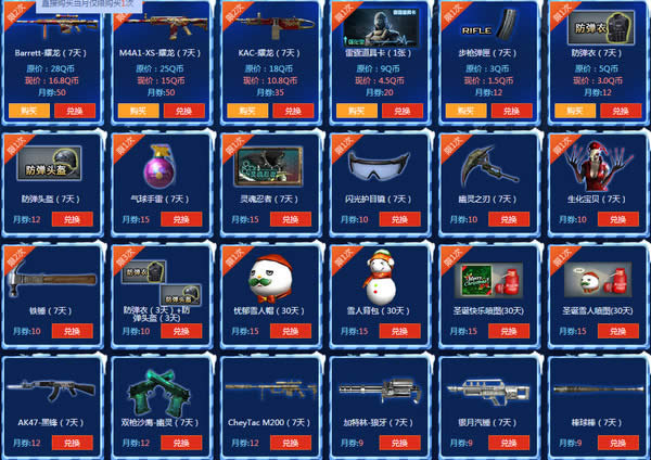 cf1月军火基地活动暂未开启,玩家可以先参加12月的军火基地活动,收藏本页面,等到1月再来签到领奖吧! 活动时间:2015年12月1日——12月31日 兑换劵获得: 签到领券:每日签到 +1兑换券 ( 每月首次 +10兑换券 ) 经验领券: 1000≤经验<4000+2兑换券 经验≥4000+5兑换券 游戏十天:领20张兑换券 杀敌4000:领40兑换劵 一、兑换专区