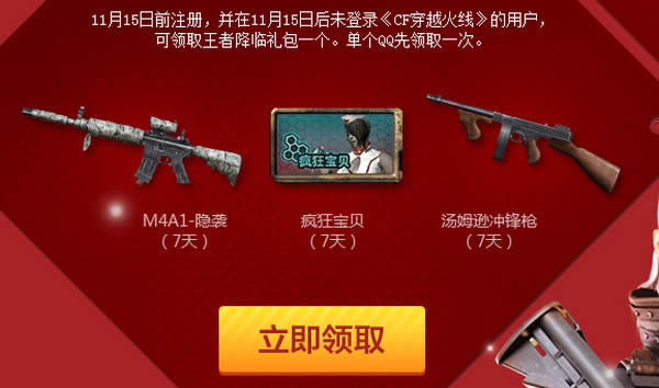 2、王者降临礼包:11月15日前注册,并在11月15日后未登录《CF穿越火线》的用户,可领取王者降临礼包一个。