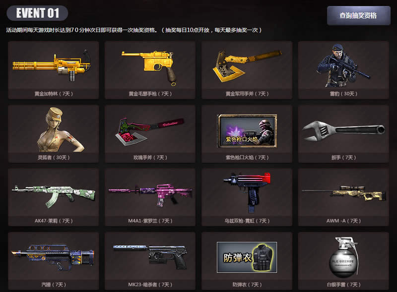 活动时间:2015年11月27日--2015年12月20日 领取时间:2015年11月28日--2015年12月21日 活动地址: 活动一 活动期间每天游戏时长达到70分钟次日即可获得一次抽奖资格。(抽奖每日10点开放,每天最多抽奖一次)