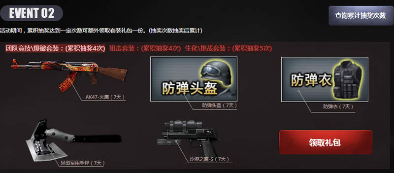 活动二 活动期间,累积抽奖达到一定次数可额外领取套装礼包一份。(抽奖次数抽奖后累计)