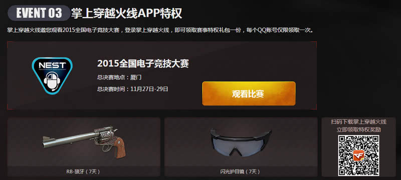 活动三 掌上穿越火线邀您观看2015全国电子竞技大赛,登录掌上穿越火线,即可领取赛事特权礼包一份,每个QQ账号仅限领取一次。