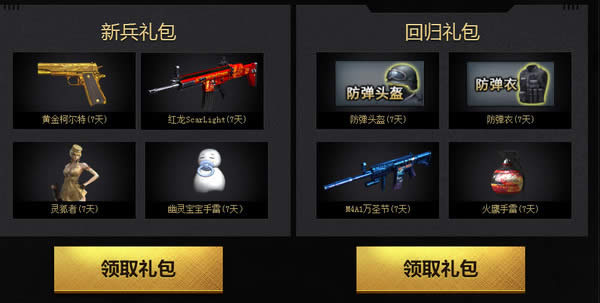 2015年11月1日以后注册的新手玩家可领取新兵礼包一份,单Q限领一次。最近1个月未登录过CF的老玩家可领取回归 礼包一份,单Q限领一次。(道具直接到账,请进入游戏查收)