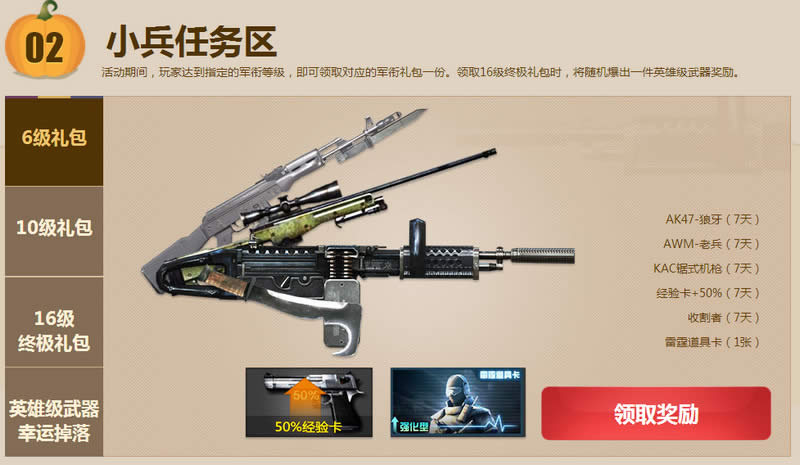 小兵任务区 活动期间,玩家达到指定的军衔等级,即可领取对应的军衔礼包一份。领取16级终极礼包时,将随机爆出一件英雄级武器奖励。