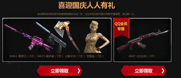 2.活动期间所有玩家可免费领取国庆礼包一份,QQ会员可额外领取专属道具,单Q限一次。