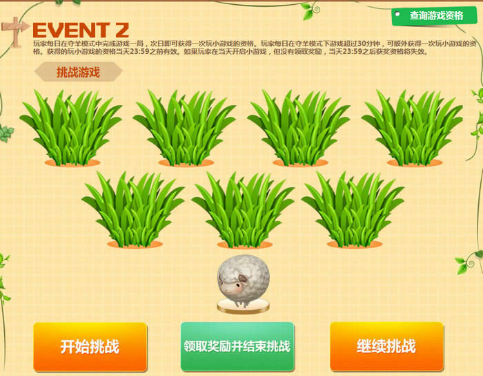 玩家每日在夺羊模式中完成游戏一局,次日即可获得一次玩小游戏的资格。玩家每日在夺羊模式下游戏超过30分钟,可额外获得一次玩小游戏的资格。获得的玩小游戏的资格当天23:59之前有效。如果玩家在当天开启小游戏,但没有领取奖励,当天23:59之后获奖资格将失效。
