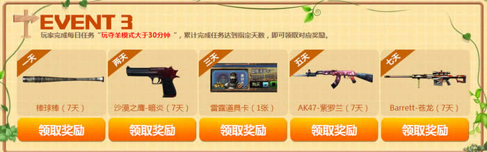 玩家完成每日任务“玩夺羊模式大于30分钟“,累计完成任务达到指定天数,即可领取对应奖励。