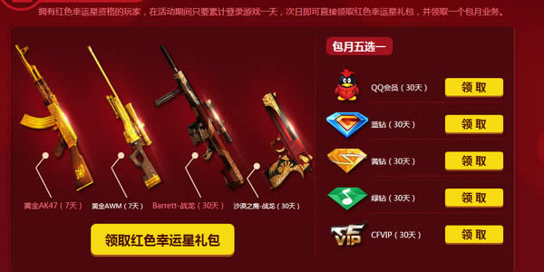 拥有红色幸运星资格的玩家,在活动期间只要累计登录游戏一天,次日即可直接领取红色幸运星礼包,并领取一个包月业务。