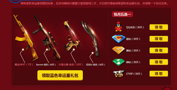 穿越火线CF超级幸运星活动来袭;本次cf超级幸运星9月活动累计登陆就可以获得超级幸运玩家资格;幸运玩家完成任务即可获得qq会员、蓝钻等五选一的奖励,另外还有活动最高奖黄金AK-47在等着你哦!下面我们就一起来看看活动详情吧