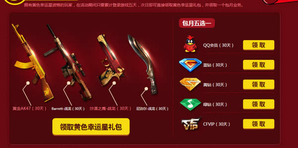 拥有黄色幸运星资格的玩家,在活动期间只要累计登录游戏五天,次日即可直接领取黄色幸运星礼包,并领取一个包月业务。