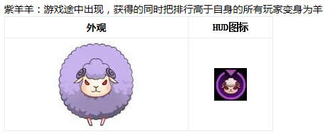 紫羊羊:游戏途中出现,获得的同时把排行高于自身的所有玩家变身为羊