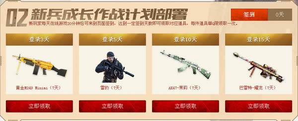 新玩家每天在线游戏20分钟后可来到页面签到,达到一定签到天数即可领取对应道具,每件道具单Q限领取一次。