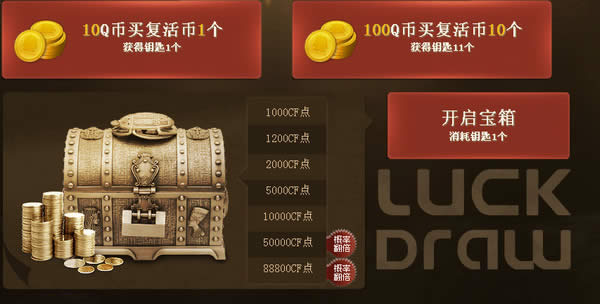 购买复活币同时可获得钥匙,钥匙可用来开启CF点大宝箱,随机抽取不同数量的CF点。