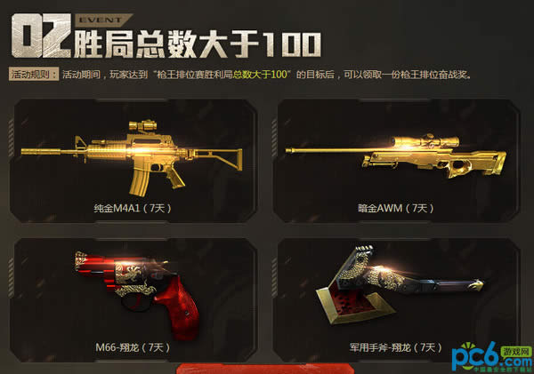活动规则:活动期间,玩家达到“枪王排位赛胜利局总数大于100”的目标后,可以领取一份枪王排位奋战奖。