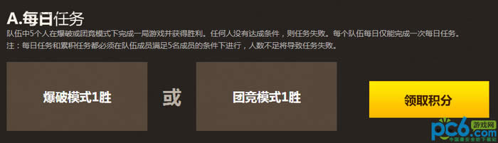 队伍中5个人在爆破或团竞模式下完成一局游戏并获得胜利。任何人没有达成条件,则任务失败。每个队伍每日仅能完成一次每日任务。