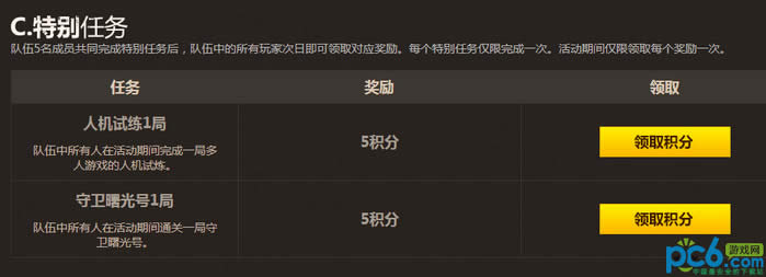 队伍5名成员共同完成特别任务后,队伍中的所有玩家次日即可领取对应奖励。每个特别任务仅限完成一次。活动期间仅限领取每个奖励一次。