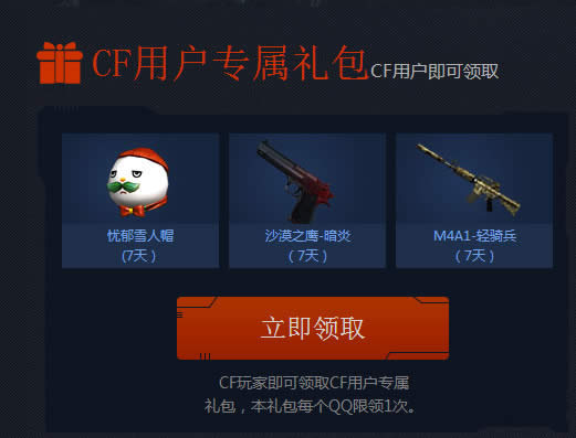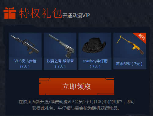 2.CF用户专属礼包领取规则:CF用户绑定角色后即可领取。每个QQ限领一个。特权礼包领取规则:CF用户登陆后,通过活动页面引导开通1个月以上动漫VIP后即可领取。