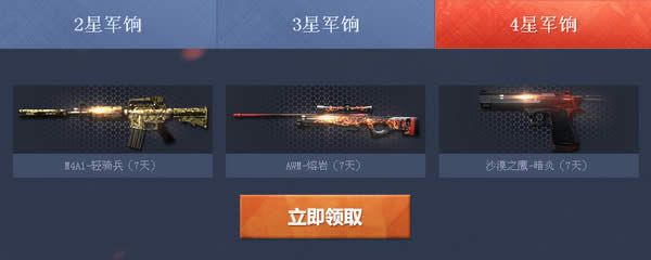 4星军饷:M4A1-轻骑兵(7天)、AWM-熔岩(7天)、沙漠之鹰-暗炎(7天)