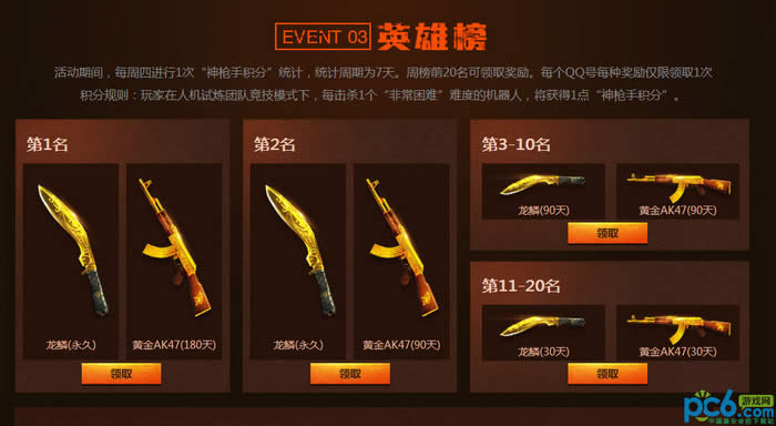 活动期间,每周四进行1次“神枪手积分”统计,统计周期为7天。周榜前20名可领取奖励。每个QQ号每种奖励仅限领取1次