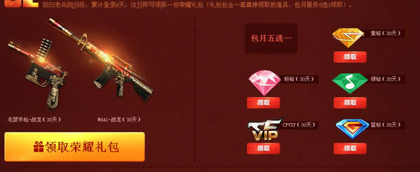 回归老兵回归后,累计登录6天,次日即可领取一份荣耀礼包(礼包包含一套直接领取的道具、包月服务5选1领取)。