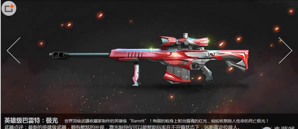 从这把枪的外形看,巴雷特极光非常具有高科技的特征,属性方面很可能有特殊功能,和另一把英雄级狙击枪巴雷特毁灭有不同的特殊属性。